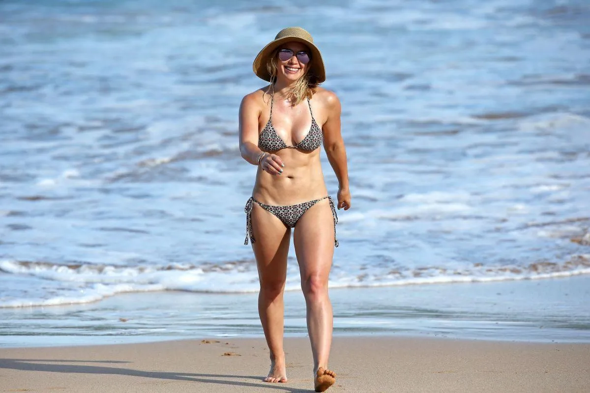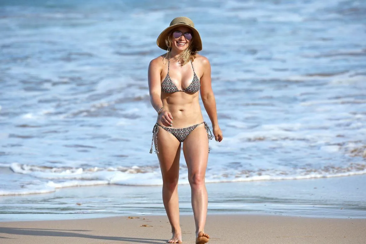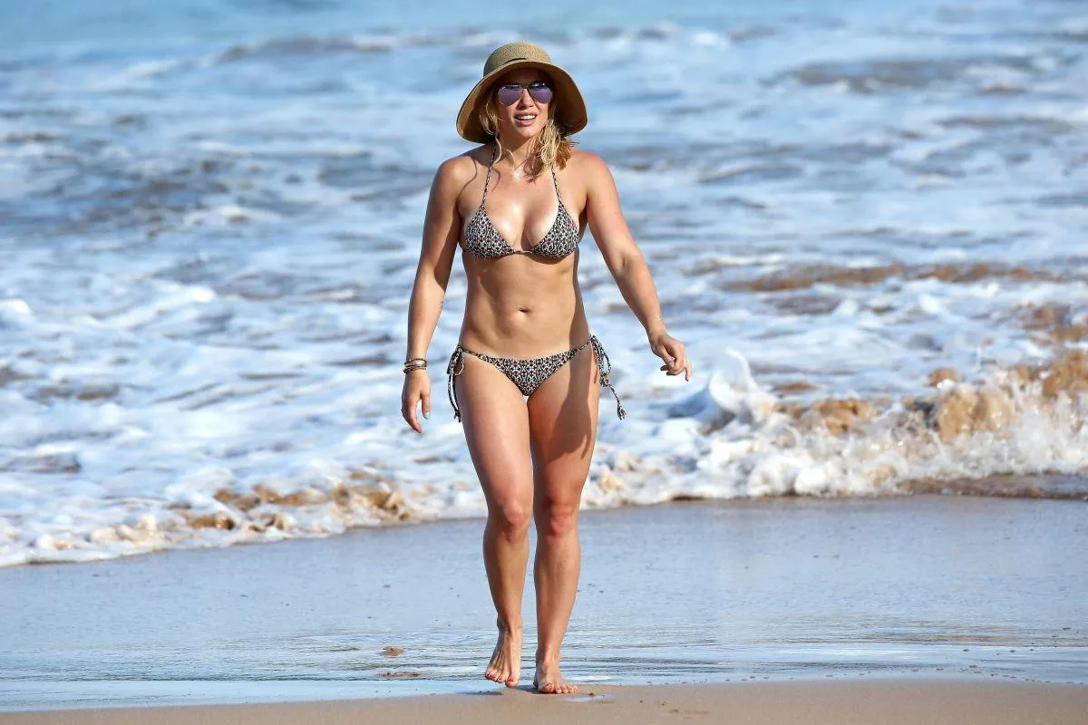 Hilary Duff, an American actress, singer, and businesswoman, has a set of paparazzi images from a bikini beach outing that has been leaked. She gained notoriety as a Disney Channel child star in the title role of Lizzie McGuire.